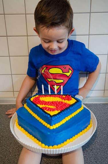 On the Sunday before Matt’s birthday, my friend, a cake baker extraordinaire, asked what I was doing for Matt’s cake. I responded that I was going to open a cake mix, make it into cupcakes, ice it using pre bought frosting… She stopped me before I could even finish, disgusted, and then said, “I would like to bake Matthew a birthday cake, what do you want it to look like?” I gladly took her up on her offer… she is so sweet. I told her that he was getting a few super Hero things for his birthday and she liked the idea of a Superman cake. It couldn’t have turned out better. We all LOVED it and it was one of the very best chocolate cakes I think I’ve EVER tasted.